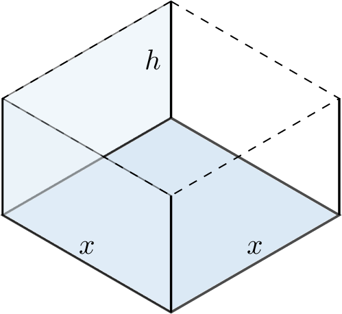 A box has a volume of \(1 \,\text{m}^3\), a square base, and an open top. Find the dimensions of the box which minimize its surface area (verification with the second derivative test is optional).