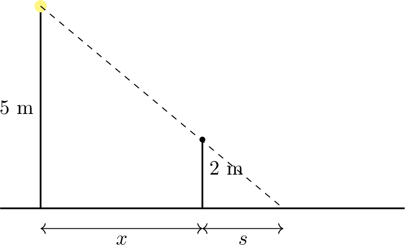 A street lamp is 5 m tall. A person 2 m tall walks away from the lamp at a speed of 1.2 m/s. Let \(x\) be the distance of the person from the base of the lamp, and \(s\) the length of their shadow.