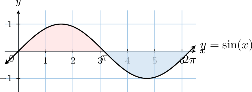Find the total area of the region enclosed by the x-axis and the curve \(y=\sin(x)\) from \(x=0\) to \(x=2\pi\).