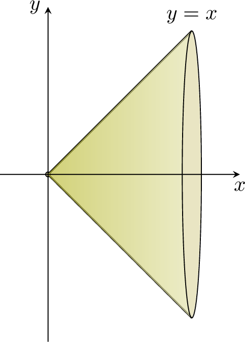 The area bounded by the line \(y=x\) and the x-axis is revolved around the x-axis to form a cone.