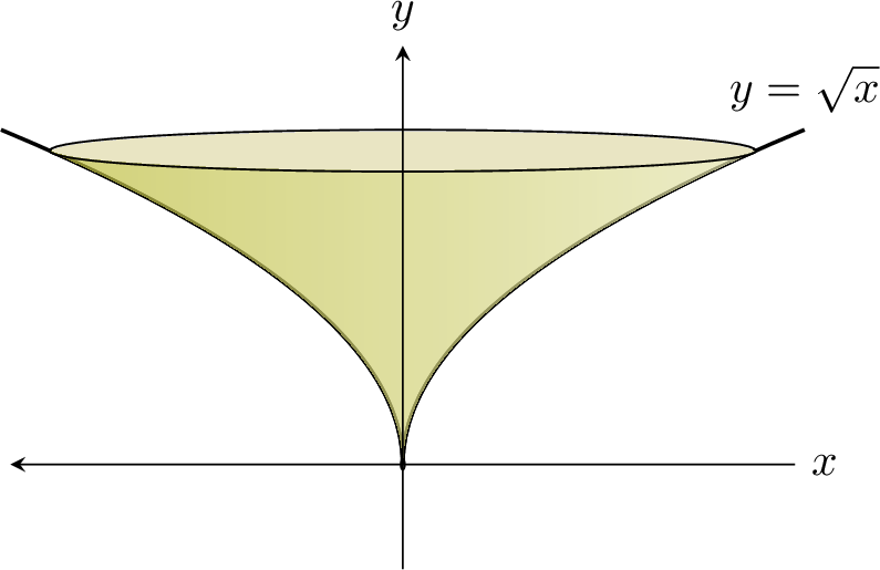 To find the volume of this solid, we use the same strategy as for area: slice the solid into many thin pieces and sum their volumes. In this case, each slice is a thin cylindrical disk. The key insight is that each disk is formed by rotating one of the thin rectangles from a Riemann sum around the \(x\)-axis.