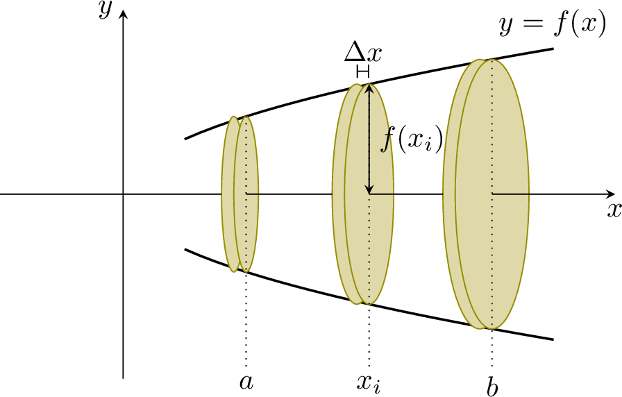 The volume of one disk is \(V_i = \pi [f(x_i)]^2 \Delta x\). The total volume is approximated by summing the volumes of all the disks:$$\begin{aligned}\mathcal{V}&\approx \sum_{i=0}^{n-1}V_i\\