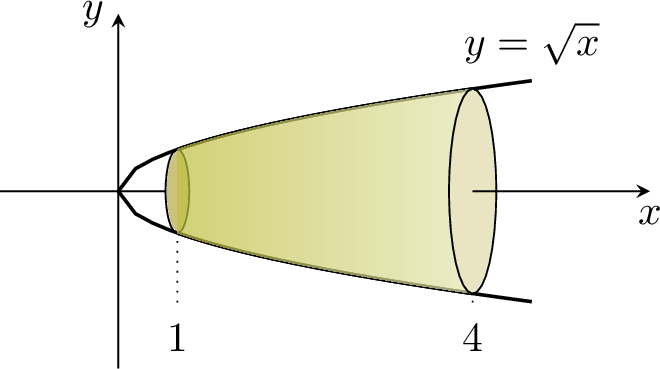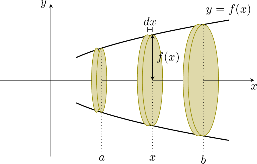 exactly, we take the limit as the number of disks goes to infinity and their thickness approaches zero (\(\Delta x \to 0\)). This limit is the definite integral:$$\begin{aligned}\mathcal{V}&= \lim_{n \to \infty} \sum_{i=0}^{n-1} \pi [f(x_i)]^2 \Delta x\\