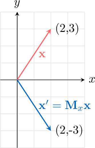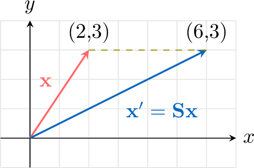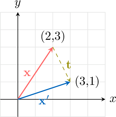 We consider how an object point \((x, y)\), specified by its vector position \(\mathbf{x} = \begin{pmatrix} x \\ y \end{pmatrix}\), is moved to an image point \((x', y')\), specified by its vector position \(\mathbf{x}' = \begin{pmatrix} x' \\ y' \end{pmatrix}\), using matrices.