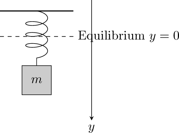 A mass \(m\) is attached to a vertical spring. According to Hooke's Law and Newton's Second Law, its displacement \(y(t)\) from the equilibrium position is governed by the second-order differential equation:$$m\frac{d^2 y}{dt^2} = -ky$$where \(k\) is the positive spring constant. This describes Simple Harmonic Motion.