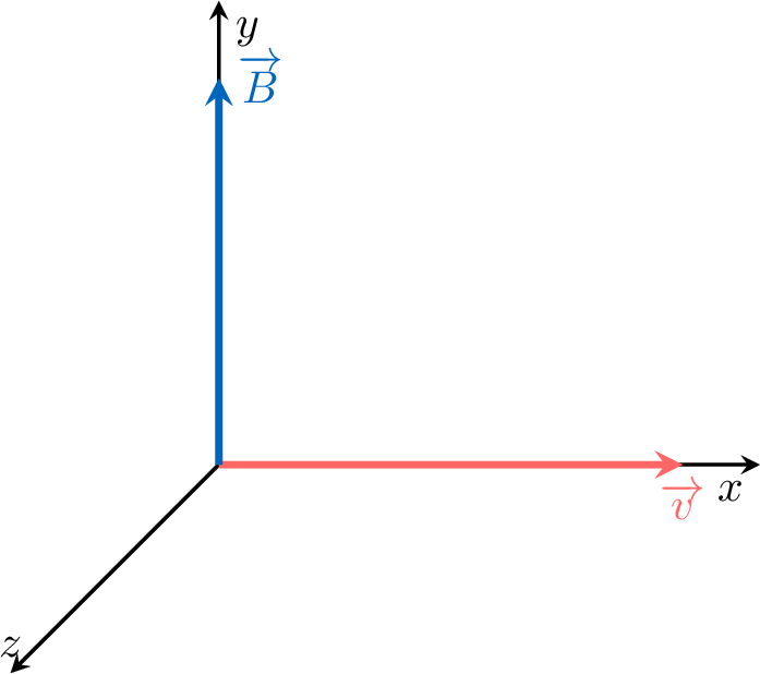 The magnetic force \(\Vect{F}\) exerted on a particle with electric charge \(q\) moving with velocity \(\Vect{v}\) through a magnetic field \(\Vect{B}\) is given by the Lorentz force formula:$$ \Vect{F} = q(\Vect{v} \times \Vect{B}) $$A particle with charge \(q = 2\) C enters a uniform magnetic field \(\Vect{B} = \begin{pmatrix} 0 \\ 5 \\ 0 \end{pmatrix}\) T with a velocity of \(\Vect{v} = \begin{pmatrix} 3 \\ 0 \\ 0 \end{pmatrix}\) m/s, as shown below.