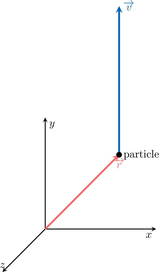 The angular momentum \(\Vect{L}\) of a particle relative to a point of origin is a measure of its rotational motion. It is defined by the vector product of the particle's position vector \(\Vect{r}\) and its linear momentum vector \(\Vect{p}\), where \(\Vect{p} = m\Vect{v}\).$$ \Vect{L} = \Vect{r} \times \Vect{p} $$A particle of mass \(m=3\) kg is at position \(\Vect{r} = \begin{pmatrix} 2 \\ 2 \\ 0 \end{pmatrix}\) m and is moving with a velocity \(\Vect{v} = \begin{pmatrix} 0 \\ 4 \\ 0 \end{pmatrix}\) m/s.