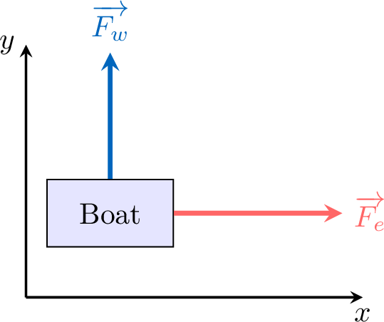 A boat of mass \(m=200\) kg is moving on the surface of a lake. The boat's engine exerts a force \(\Vect{F_e}\) of \(600\) N towards the East (positive x-direction). The wind exerts a force \(\Vect{F_w}\) of \(200\) N towards the North (positive y-direction). Friction is negligible.