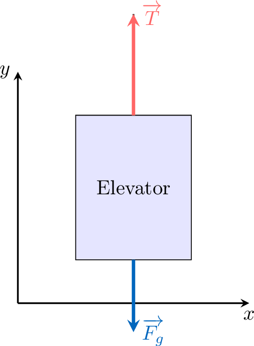 An elevator of mass \(m=500\) kg is supported by a cable that exerts an upward tension force \(\Vect{T}\) with a magnitude of \(5900\) N. The force of gravity, \(\Vect{F_g}\), acts downwards. The y-axis is oriented vertically upwards.