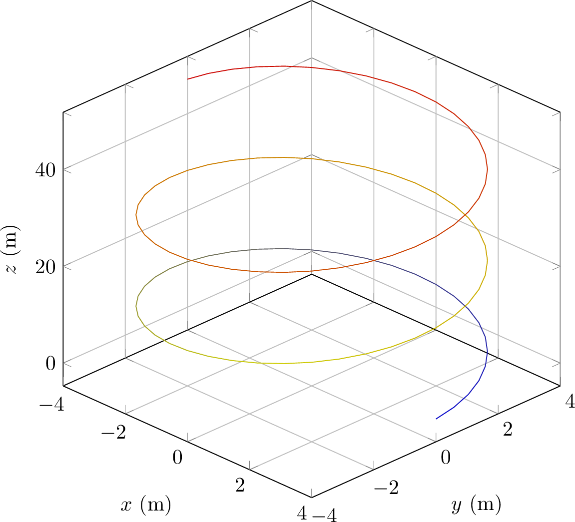 The position vector of a particle at time \(t\) seconds is given by:$$ \Vect{r}(t) = \begin{pmatrix} 4\cos(t) \\ 4\sin(t) \\ 3t \end{pmatrix} \text{ m} $$
