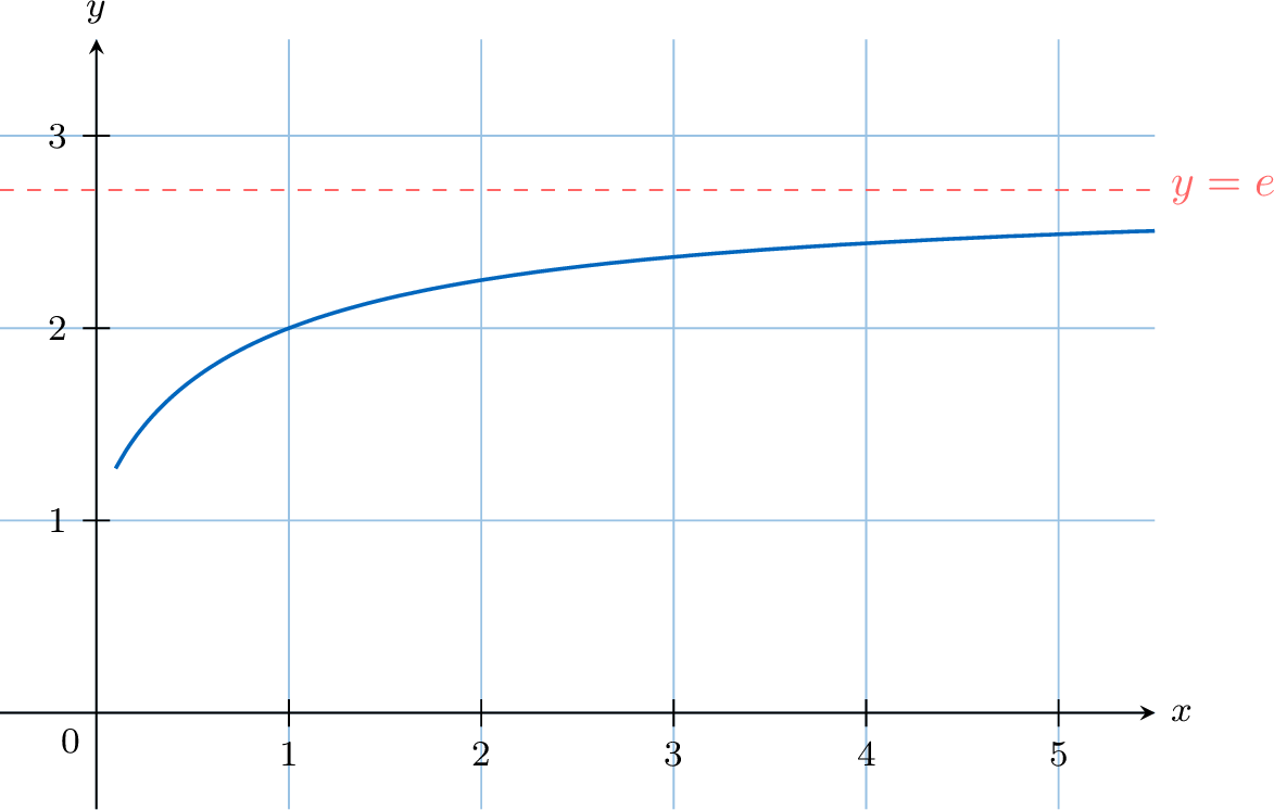 The graph of the function \(f(x) = \left(1 + \frac{1}{x}\right)^x\) is shown below for \(x>0\).