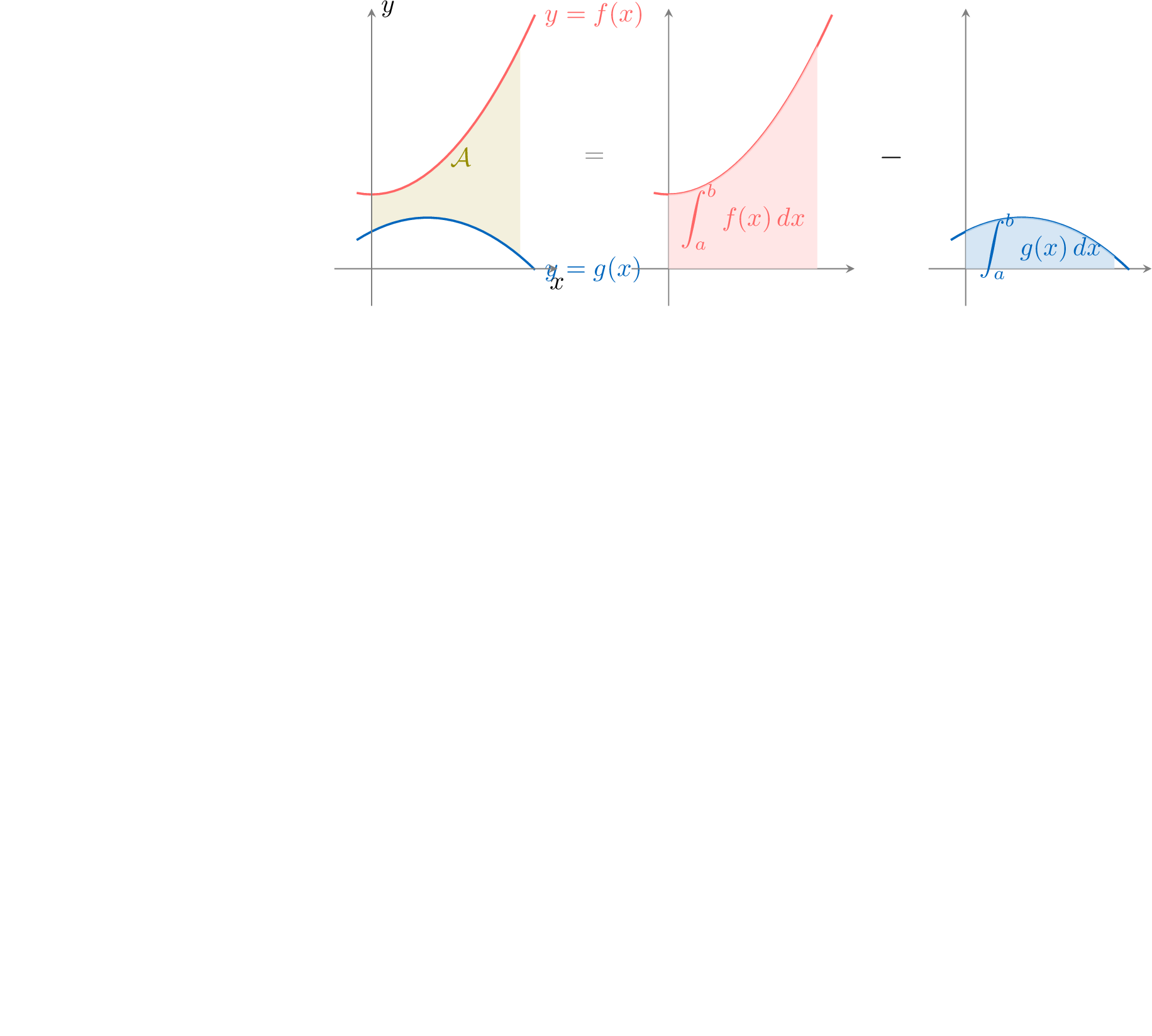 The general idea is intuitive: the area of the region bounded by an upper function \(f(x)\) and a lower function \(g(x)\) is found by calculating the area under \(f(x)\) and subtracting the area under \(g(x)\). Using the linearity of the definite integral, this subtraction can be combined into a single integral:$$\begin{aligned} \textcolor{olive}{\mathcal{A}} &= \textcolor{colordef}{ \int_a^b f(x)\; \mathrm dx} - \textcolor{colorprop}{ \int_a^b g(x)\; \mathrm dx} \\ &= \int_a^b (f(x)-g(x))\; \mathrm dx \end{aligned} $$
