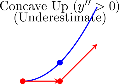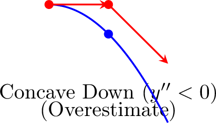 The core of the method is to approximate the derivative \(\dfrac{dy}{dx}\) using the gradient of the line segment connecting two consecutive points, \((x_n, y_n)\) and \((x_{n+1}, y_{n+1})\):$$ \dfrac{dy}{dx} \text{ at } (x_n, y_n) \approx \dfrac{y_{n+1} - y_n}{x_{n+1} - x_n} = \dfrac{y_{n+1} - y_n}{h}. $$Since the differential equation gives us the exact value of the derivative, \(\dfrac{dy}{dx} = f(x_n, y_n)\), we can set these equal:$$ \dfrac{y_{n+1} - y_n}{h}\approx f(x_n, y_n). $$Rearranging this formula to find the next \(y\)-value, \(y_{n+1}\), gives the iterative step:$$ y_{n+1} \approx y_n + h \cdot f(x_n, y_n). $$The collection of line segments created by this iterative procedure forms a polygonal approximation to the true solution curve.