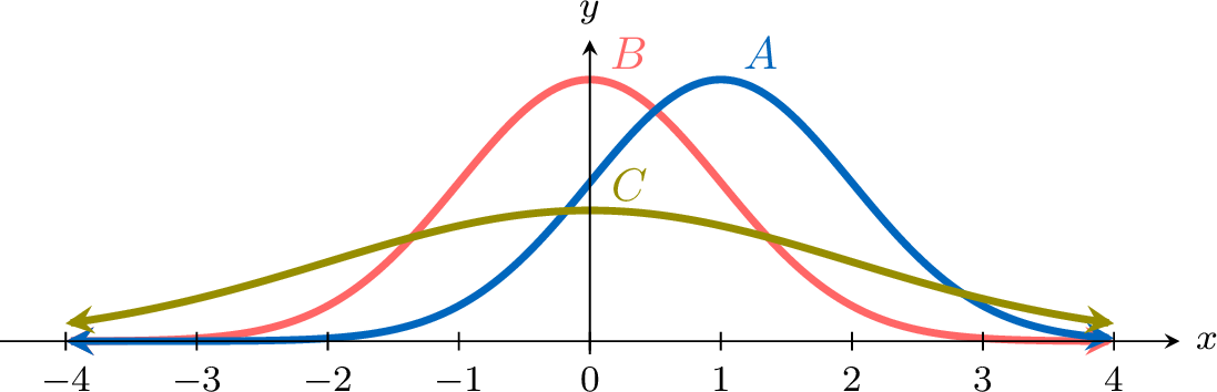 Consider three normal distributions \( A \), \( B \), and \( C \), each represented by their probability density functions as shown below.