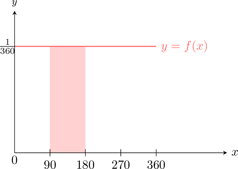 &= \frac{1}{4}\end{aligned}$$Hence, the probability of spinning an angle between 90 and 180 degrees is \(\frac{1}{4}\).