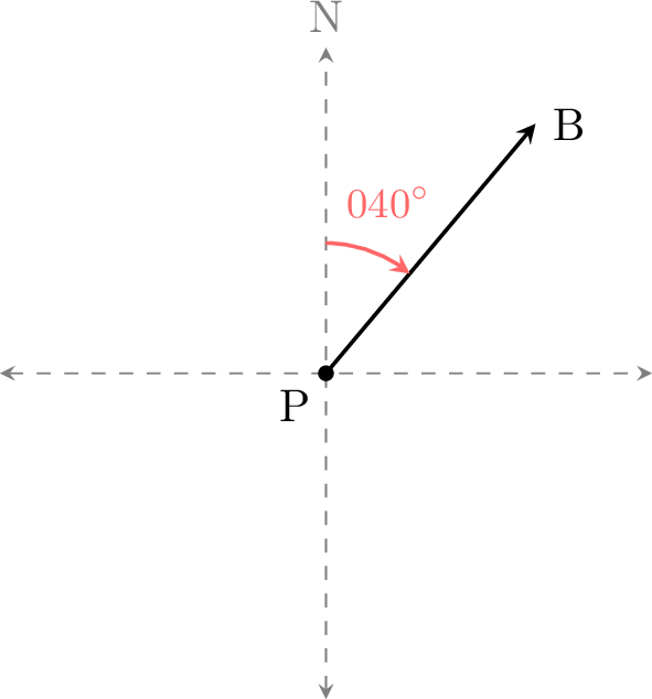 • The bearing of B from P is \(040^\circ\).