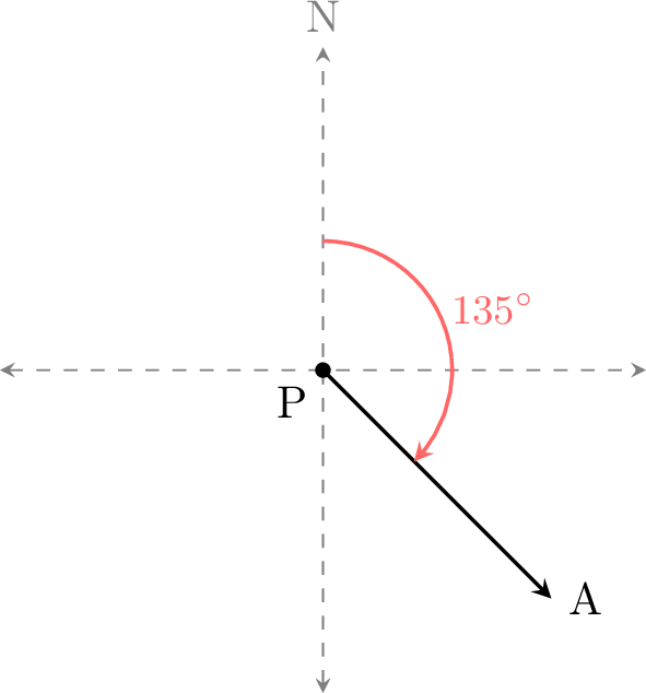 • The bearing of A from P is \(135^\circ\).