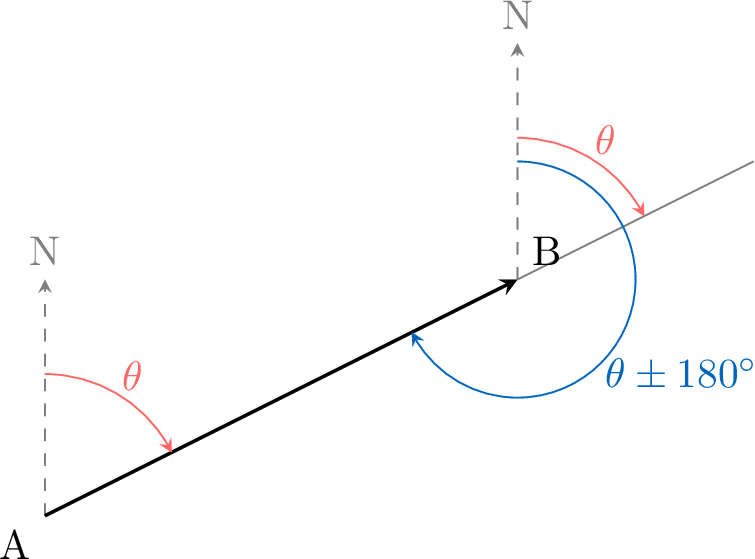 • Back Bearings: The bearing from point A to point B is the forward bearing. The bearing from point B back to point A is the back bearing. A back bearing always differs by \(180^\circ\) from the forward bearing (add or subtract \(180^\circ\) and, if necessary, bring the result back between \(000^\circ\) and \(360^\circ\)).