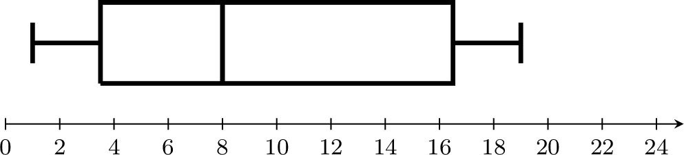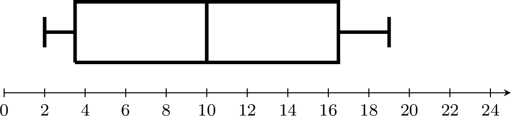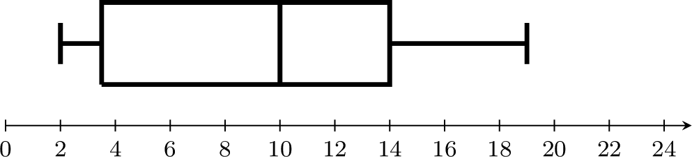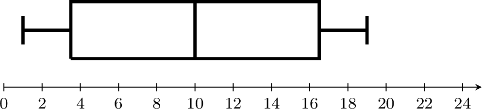 The five-number summary for a dataset is:$$ \text{Min} = 1, \quad Q_1 = 3.5, \quad \text{Median} = 10, \quad Q_3 = 16.5, \quad \text{Max} = 19 $$