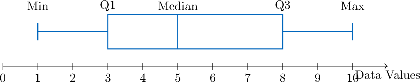 A box plot visually displays the five-number summary above a number line.