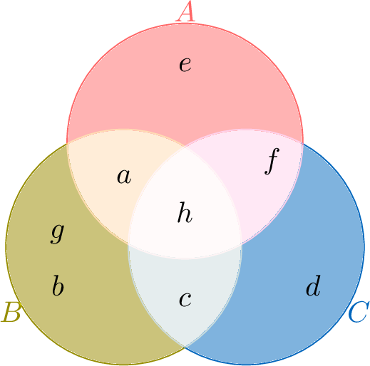 You are given this populated Venn diagram representing events \(A\), \(B\), and \(C\):