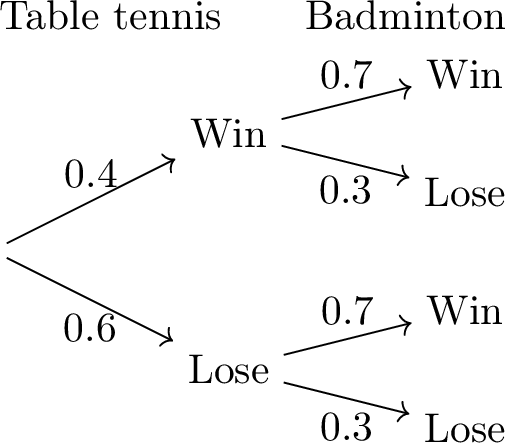 Niamh plays a game of table tennis on Saturday and a game of badminton on Sunday. The probability of winning table tennis is \(0.4\) and the probability of winning badminton is \(0.7\). The two events are independent. The probability tree is shown below: