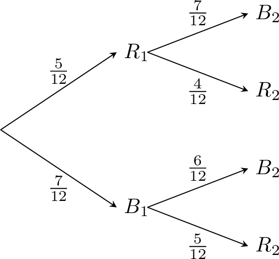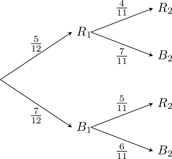 A bag contains 5 red (R) and 7 blue (B) marbles. One marble is drawn and not replaced, and then a second marble is drawn.