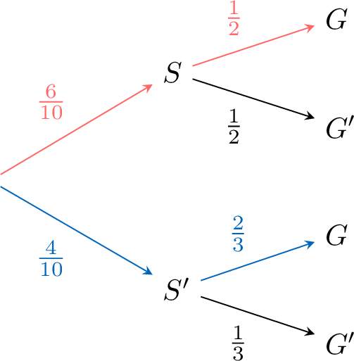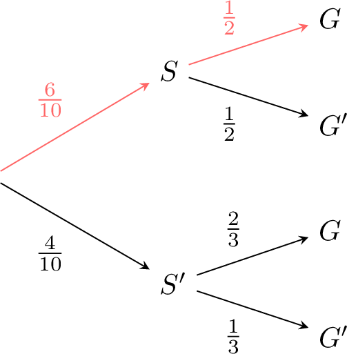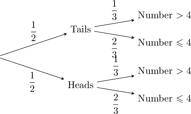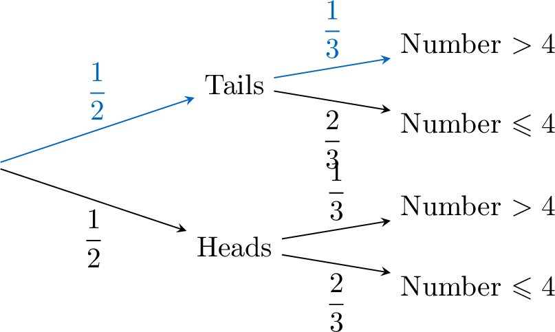 $$\textcolor{colorprop}{P(\text{"Tails" and "Number > 4"})=\frac{1}{2}\times \frac{1}{3}}$$