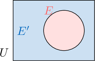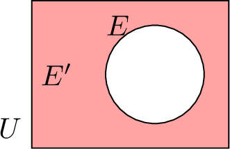 | \(E'\) | Complement of \(E\) in \(U\) | Complement of \(E\) in \(U\) | |