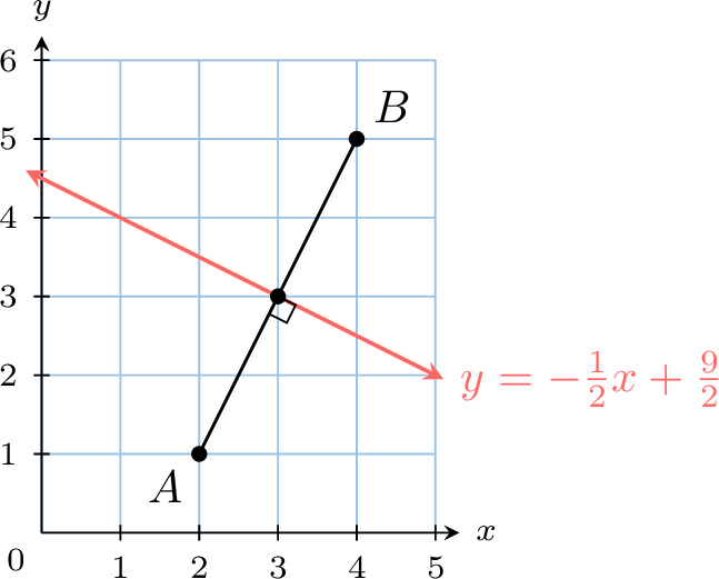 3. The midpoint of \(\Segment{AB}\) is$$M = \left(\frac{2+4}{2}, \frac{1+5}{2}\right) = (3, 3).$$