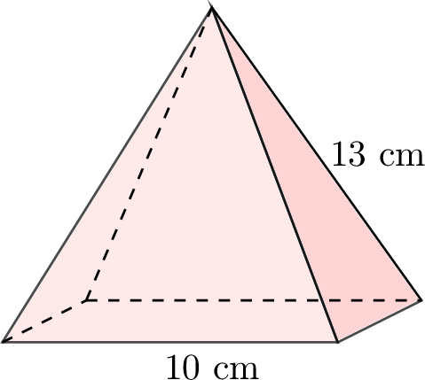 A square-based pyramid has a base side length of 10 cm and a slant height (the height of each triangular face) of 13 cm. Calculate the volume of the pyramid.