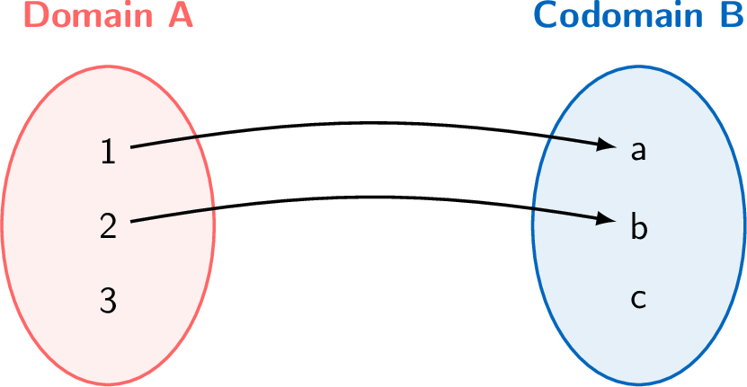 A rule \(g\) maps elements from the set \(A = \{1, 2, 3\}\) to the set \(B = \{a, b, c\}\). The mappings are shown in the diagram below.
