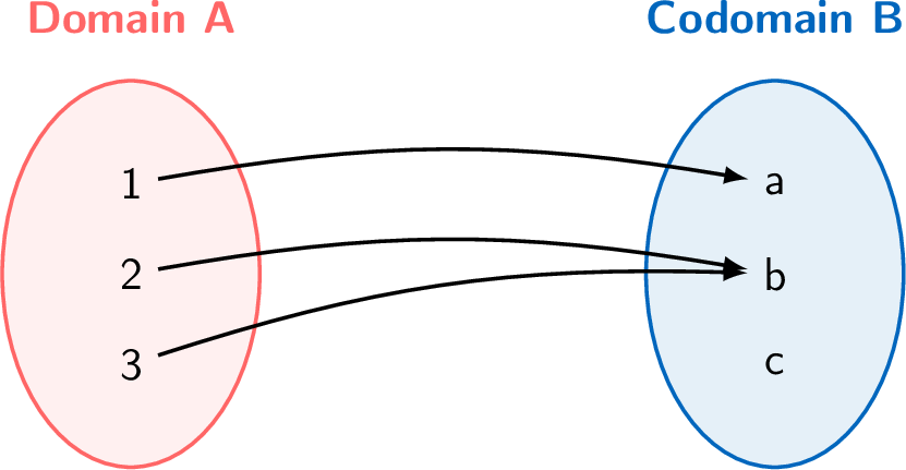 A rule \(h\) maps elements from the set \(A = \{1, 2, 3\}\) to the set \(B = \{a, b, c\}\). The mappings are shown in the diagram below.