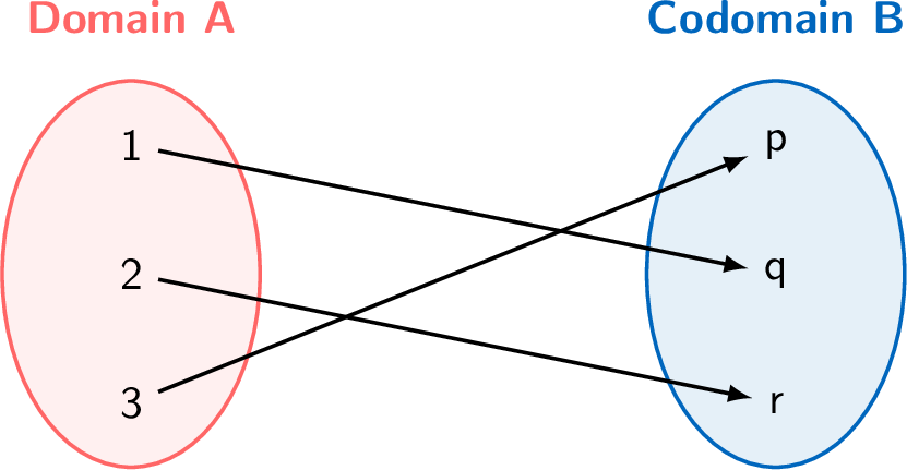 Let \(A = \{1, 2, 3\}\) and \(B = \{p, q, r\}\). A function \(h:A\rightarrow B\) is defined by the mapping diagram below.