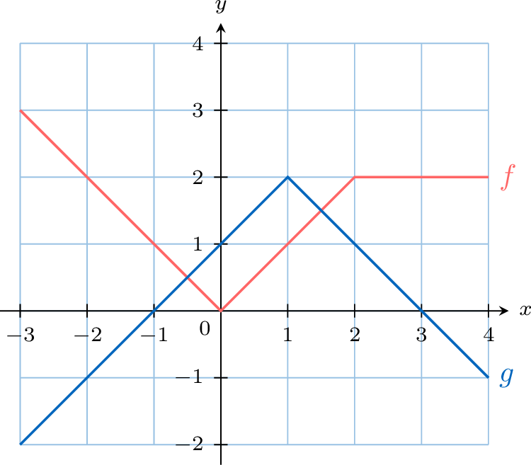 The graphs of two functions, \(f\) and \(g\), are shown below.