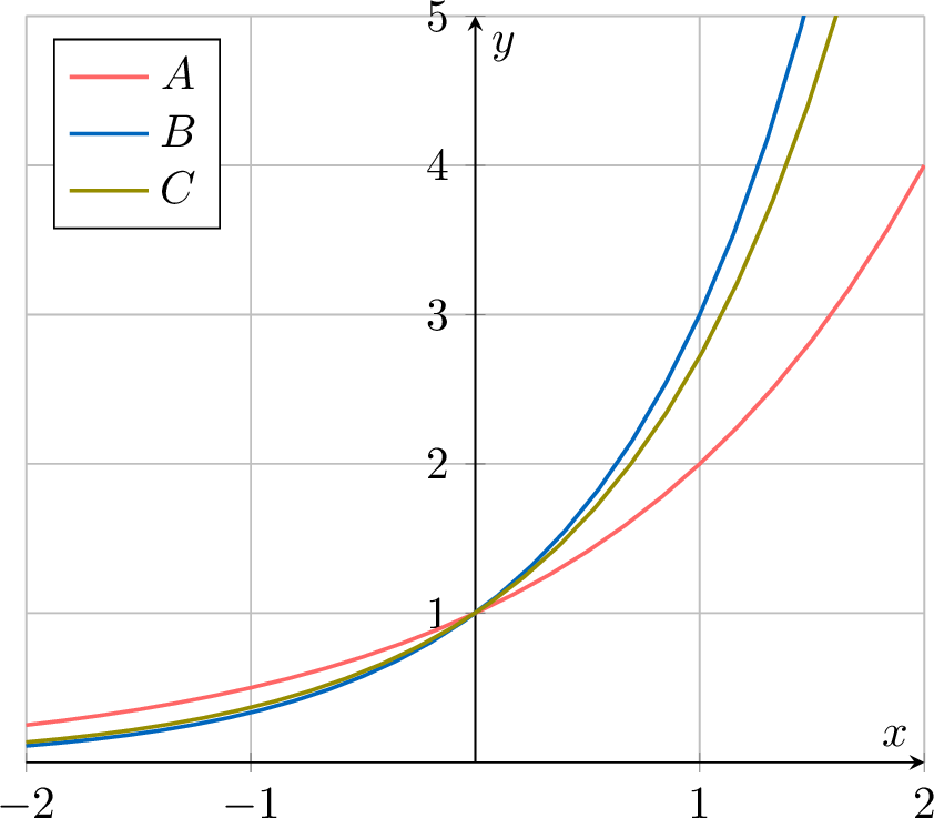 The graphs of \(y=2^x\), \(y=3^x\), and \(y=e^x\) are plotted below. Identify which curve corresponds to \(y=e^x\).