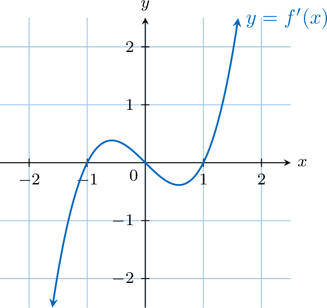 The graph of the derivative function, \(f'(x)=x^3-x\), is shown below. Use it to determine the variations of the original function, \(f\).