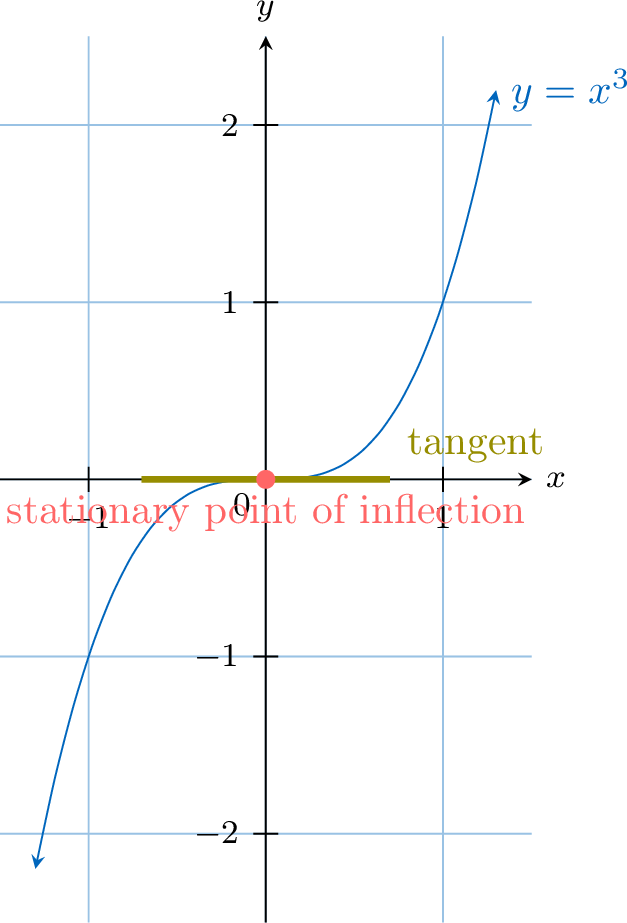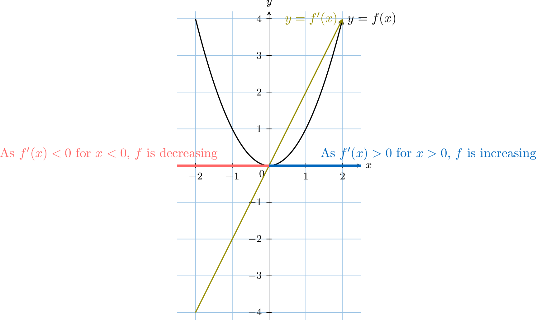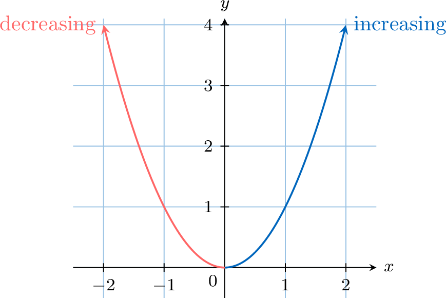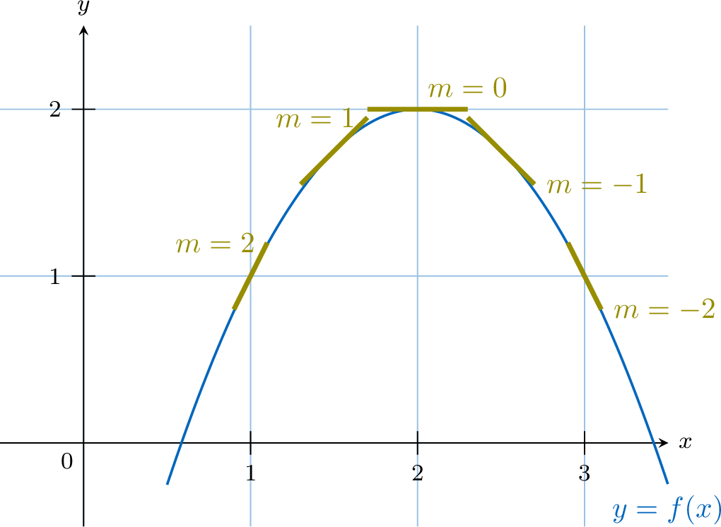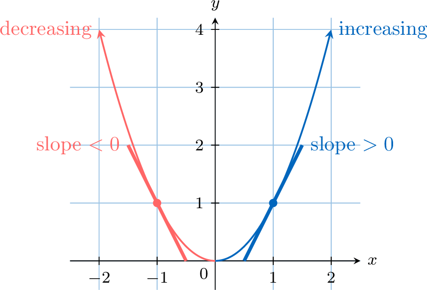As we move along the curve from left to right, \(x\) increases, but the slope of the tangent decreases (from \(2\), to \(1\), to \(0\), to \(-1\), etc.).