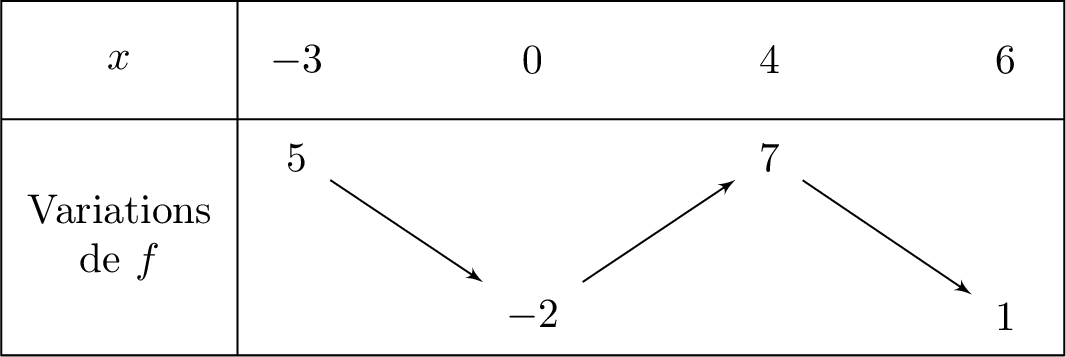 À partir du tableau de variations ci-dessous, réponds aux questions suivantes :