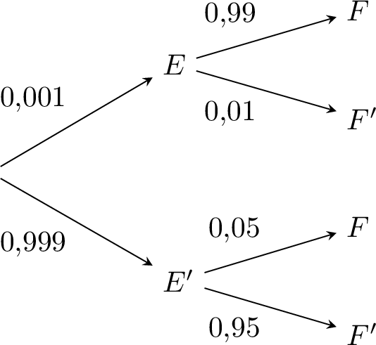 - \(P(E) = \frac{1}{1000} = 0{,}001\), donc \(P(E') = 1 - 0{,}001 = 0{,}999\).