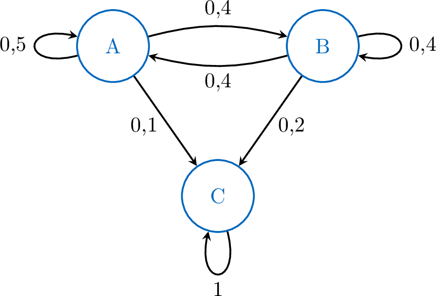 On considère une chaîne de Markov \((X_n)\) à trois états \(A, B\) et \(C\). Les probabilités de transition sont modélisées par le graphe ci-dessous. Le système démarre dans l'état \(A\), donc \(\pi_0 = \begin{pmatrix} 1 & 0 & 0 \end{pmatrix}\).