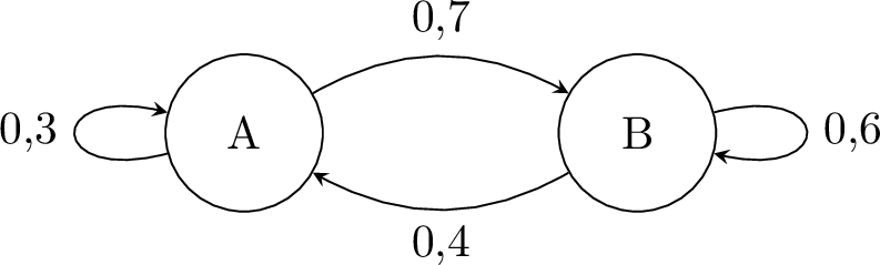Un rat de laboratoire est placé dans un labyrinthe avec deux salles, Salle A et Salle B. Le diagramme de transition ci-dessous montre la probabilité que le rat change de salle ou reste dans la même salle chaque minute.