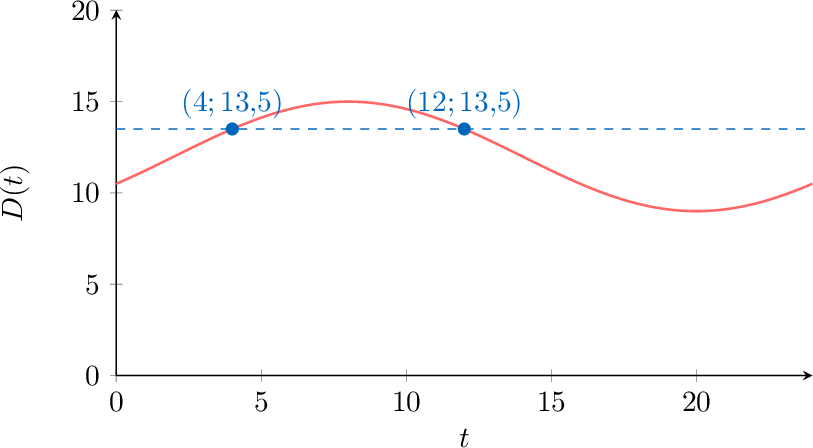 La profondeur de l'eau, \(D\), en mètres, dans un port peut être modélisée par la fonction $$ D(t) = 3 \sin\left( \frac{\pi}{12} (t - 2) \right) + 12, \quad 0 \leq t < 24 $$ où \(t\) est le temps écoulé, en heures, depuis minuit.