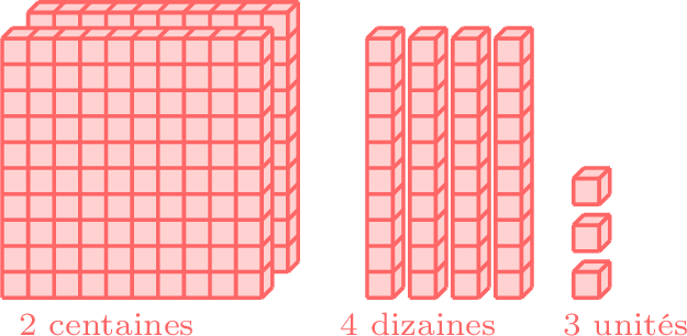 • En forme développée : $$\begin{aligned}[t] 2\text{ centaines }&+ &4\text{ dizaines }&+& 3\text{ unités }\\ 200 &+&40&+&3 \\ \end{aligned}$$