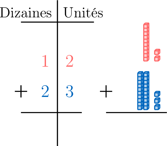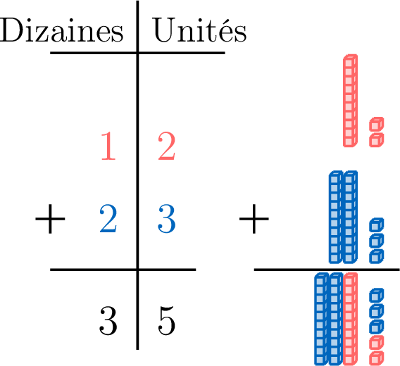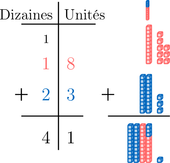 Au total, il y a \(\textcolor{colordef}{18} + \textcolor{colorprop}{23} = \textcolor{olive}{41}\) cubes.