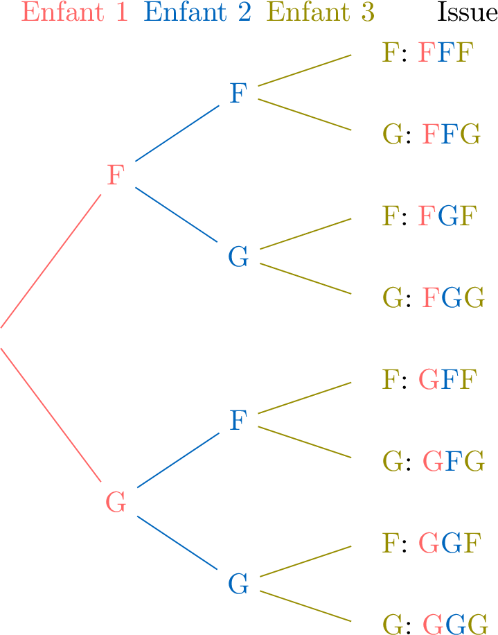 Les parents ont trois enfants, chacun pouvant être un garçon (G) ou une fille (F). L'arbre des probabilités ci-dessous montre les 8 issues possibles des sexes pour les trois enfants.
