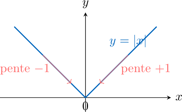 L'exemple classique est la fonction valeur absolue \(x \mapsto |x|\) en 0 :