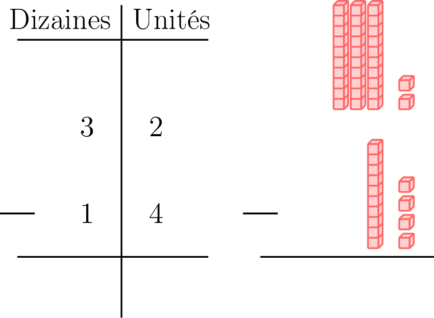 • Résultat : La différence est de 1 dizaine et 8 unités. Donc, $$32 - 14 = 18$$