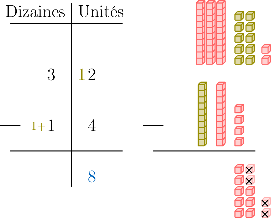 • Étape 4 : Soustraire les unités. C'est facile maintenant : $$12 \text{ unités} - 4 \text{ unités} = 8 \text{ unités}$$