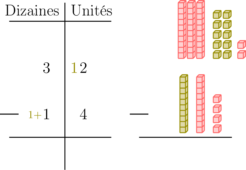 • Étape 3 : Compenser. Ajoute 10 unités au nombre du haut (ce qui donne 12 unités). Pour que cela reste juste, il faut aussi ajouter 1 dizaine au nombre du bas (ce qui donne 2 dizaines).